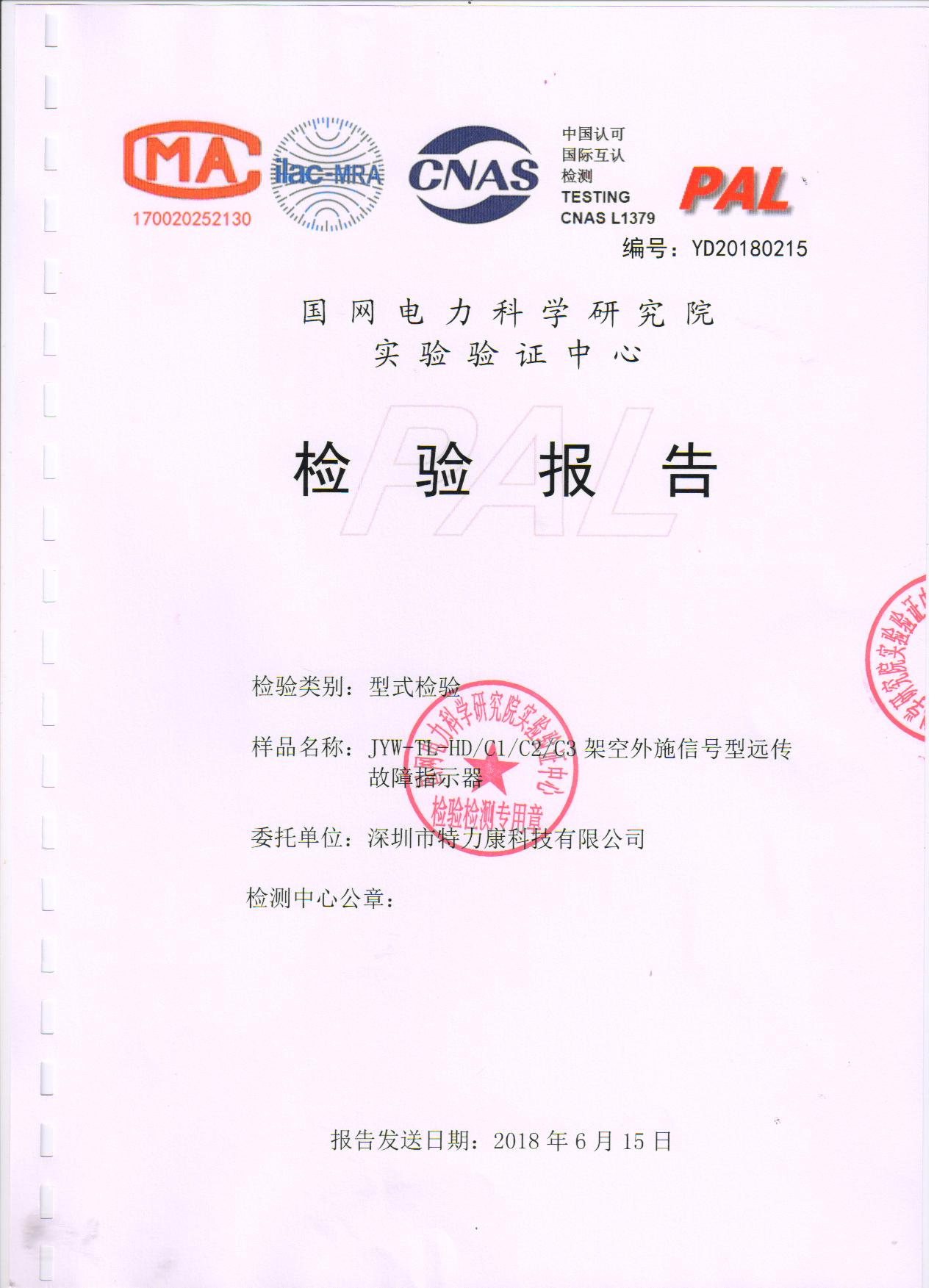 我司專注輸電線路在線監(jiān)測十二年,在智能電網(wǎng)監(jiān)測領(lǐng)域已有了不凡的地位。然而,為了更好的為電力智能化管理做出貢獻,我司大力組建研發(fā)團隊致力于配網(wǎng)故障監(jiān)測產(chǎn)品開發(fā),經(jīng)多年研發(fā)與掛網(wǎng)測試,于2018年1月20日,經(jīng)邀請,攜帶我司研發(fā)的架空暫態(tài)特征型、架空信號遠傳型故障指示器,前往國家電網(wǎng)電力科學研究院進行抽檢試驗及測試。在長達將近5個月的各項性能測試后,我司架空暫態(tài)特征型、架空信號遠傳型故障指示器的測試結(jié)果均達到合格。因此,于2018年6月15日國網(wǎng)電力科學研究院為我司發(fā)放了相關(guān)檢測報告證明文件(型式檢測報告)。