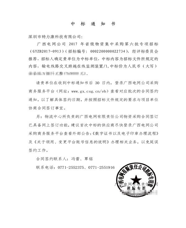特力康中標(biāo)國網(wǎng)黑龍江送變電工程公司的2024年度第18次物資類競爭性談判采購項(xiàng)目——慶陽驅(qū)鳥器物資框 特力康中標(biāo)國網(wǎng)甘肅省電力公司省管產(chǎn)業(yè)單位2024年第五次物資競爭性談判授權(quán)采購項(xiàng)目 中標(biāo)喜訊:深圳市特力康科技有限公司成功入圍許繼集團(tuán)綜合能源公司輸電線路視頻在線監(jiān)測裝置模塊集采項(xiàng)目 中標(biāo)喜訊:特力康成功中標(biāo)國網(wǎng)重慶市電力公司渝中一片區(qū)項(xiàng)目 特力康成功中標(biāo)國網(wǎng)天津市電力公司2024年第二次?物?資招標(biāo)項(xiàng)目 特力康中標(biāo)國網(wǎng)安徽省電力有限公司蕪湖供電公司2024年3月非物質(zhì)采購項(xiàng)目 特力康架空輸電線路視頻在線監(jiān)測裝置,筑牢四川電力監(jiān)控防線 智捕舞動 筑牢湖北電網(wǎng)防線——特力康輸電線路防舞動監(jiān)測系統(tǒng) 多維驅(qū)鳥 精準(zhǔn)護(hù)線——特力康一體驅(qū)鳥器筑牢河南電網(wǎng)安全屏障 拉力感知 精準(zhǔn)防冰——特力康高壓輸電線路導(dǎo)線覆冰在線監(jiān)測裝置守護(hù)貴州電網(wǎng)生命線 未冰先防 精準(zhǔn)預(yù)判——特力康模擬覆冰裝置守護(hù)遼寧電網(wǎng)寒冬生命線 特力康架空輸電線路故障監(jiān)拍裝置,筑牢湖南電網(wǎng)安全防線 特力康輸電線路微波覆冰在線監(jiān)測裝置,守護(hù)湖北電網(wǎng)寒冬安全 特力康架空輸電線路導(dǎo)線弧垂監(jiān)測裝置,守護(hù)湖北輸電線路弧垂安全 特力康輸電線路防外力破壞系統(tǒng),為江西境內(nèi)綿延的輸電線路筑起“主動防護(hù)屏障”。 特力康北斗桿塔傾斜在線監(jiān)測裝置,守護(hù)山西電網(wǎng)桿塔穩(wěn)定 特力康高壓輸電線路導(dǎo)線覆冰在線監(jiān)測裝置,為河南電網(wǎng)覆冰護(hù)航 鄂電穩(wěn)線“哨兵”:特力康舞動監(jiān)測裝置守護(hù)超高壓線路舞動安全 重慶變電站“防鳥衛(wèi)士”:特力康一體化驅(qū)鳥器守護(hù)山城電網(wǎng) 特力康輸電線路智能AI多目監(jiān)控裝置+傾斜監(jiān)測守護(hù)山西輸電生命線 鄂網(wǎng)“全景眼”:特力康一體化視頻監(jiān)控系統(tǒng)守護(hù)輸電線路 山東電網(wǎng) “穩(wěn)塔哨兵”:特力康智能桿塔傾斜監(jiān)測預(yù)警裝置筑牢電力桿塔安全防線 寧夏配電線路安裝了我司防外破電子化智能警示牌