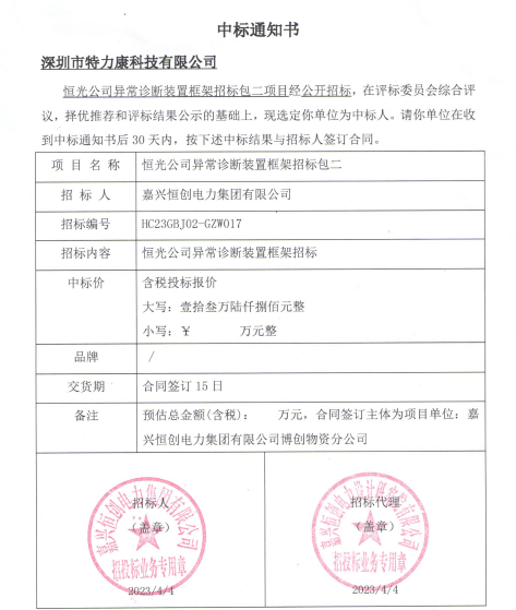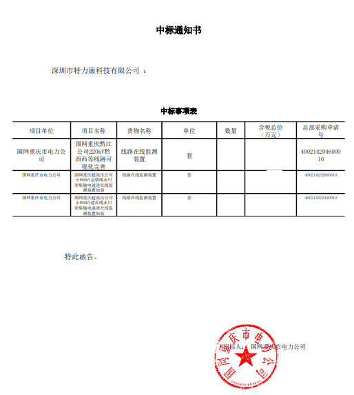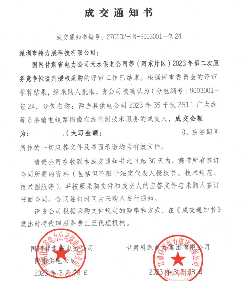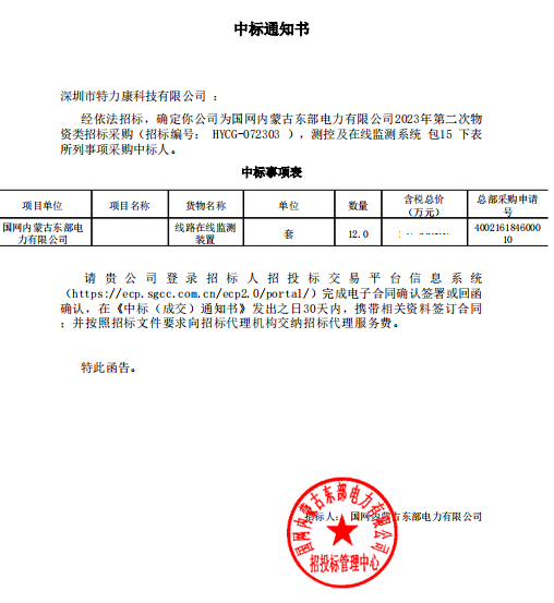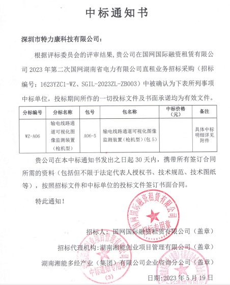 特力康中標(biāo)國網(wǎng)黑龍江送變電工程公司的2024年度第18次物資類競爭性談判采購項目——慶陽驅(qū)鳥器物資框 特力康中標(biāo)國網(wǎng)甘肅省電力公司省管產(chǎn)業(yè)單位2024年第五次物資競爭性談判授權(quán)采購項目 中標(biāo)喜訊:深圳市特力康科技有限公司成功入圍許繼集團綜合能源公司輸電線路視頻在線監(jiān)測裝置模塊集采項目 中標(biāo)喜訊:特力康成功中標(biāo)國網(wǎng)重慶市電力公司渝中一片區(qū)項目 特力康成功中標(biāo)國網(wǎng)天津市電力公司2024年第二次?物?資招標(biāo)項目 特力康中標(biāo)國網(wǎng)安徽省電力有限公司蕪湖供電公司2024年3月非物質(zhì)采購項目 特力康架空輸電線路視頻在線監(jiān)測裝置,筑牢四川電力監(jiān)控防線 智捕舞動 筑牢湖北電網(wǎng)防線——特力康輸電線路防舞動監(jiān)測系統(tǒng) 多維驅(qū)鳥 精準(zhǔn)護線——特力康一體驅(qū)鳥器筑牢河南電網(wǎng)安全屏障 拉力感知 精準(zhǔn)防冰——特力康高壓輸電線路導(dǎo)線覆冰在線監(jiān)測裝置守護貴州電網(wǎng)生命線 未冰先防 精準(zhǔn)預(yù)判——特力康模擬覆冰裝置守護遼寧電網(wǎng)寒冬生命線 特力康架空輸電線路故障監(jiān)拍裝置,筑牢湖南電網(wǎng)安全防線 特力康輸電線路微波覆冰在線監(jiān)測裝置,守護湖北電網(wǎng)寒冬安全 特力康架空輸電線路導(dǎo)線弧垂監(jiān)測裝置,守護湖北輸電線路弧垂安全 特力康輸電線路防外力破壞系統(tǒng),為江西境內(nèi)綿延的輸電線路筑起“主動防護屏障”。 特力康北斗桿塔傾斜在線監(jiān)測裝置,守護山西電網(wǎng)桿塔穩(wěn)定 特力康高壓輸電線路導(dǎo)線覆冰在線監(jiān)測裝置,為河南電網(wǎng)覆冰護航 鄂電穩(wěn)線“哨兵”:特力康舞動監(jiān)測裝置守護超高壓線路舞動安全 重慶變電站“防鳥衛(wèi)士”:特力康一體化驅(qū)鳥器守護山城電網(wǎng) 特力康輸電線路智能AI多目監(jiān)控裝置+傾斜監(jiān)測守護山西輸電生命線 鄂網(wǎng)“全景眼”:特力康一體化視頻監(jiān)控系統(tǒng)守護輸電線路 山東電網(wǎng) “穩(wěn)塔哨兵”:特力康智能桿塔傾斜監(jiān)測預(yù)警裝置筑牢電力桿塔安全防線 寧夏配電線路安裝了我司防外破電子化智能警示牌