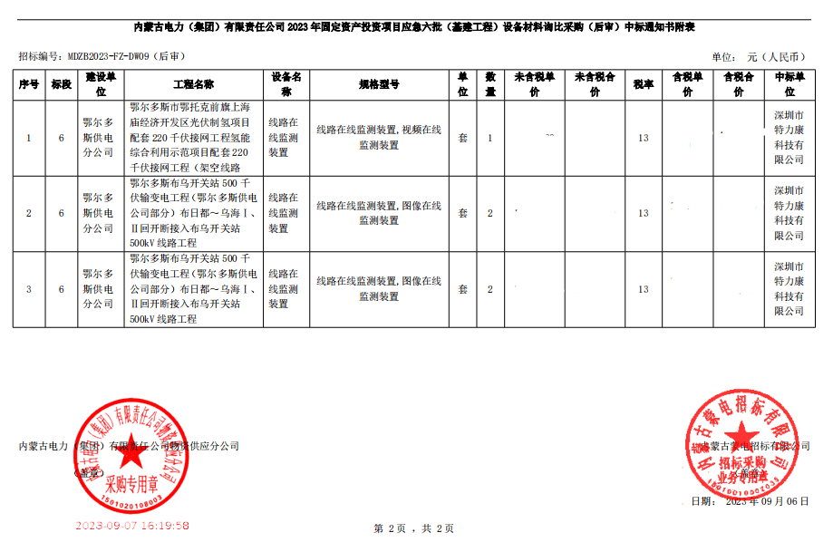 內(nèi)蒙古電力(集團(tuán))有限責(zé)任公司物資供應(yīng)分公司的采購項(xiàng)目,于2023年08月24日開標(biāo)并已完成評(píng)審工作,同時(shí)向采購人提交了該項(xiàng)目采購情況的書面報(bào)告,現(xiàn)確認(rèn)我單位為成交單位,中標(biāo)通知如下: