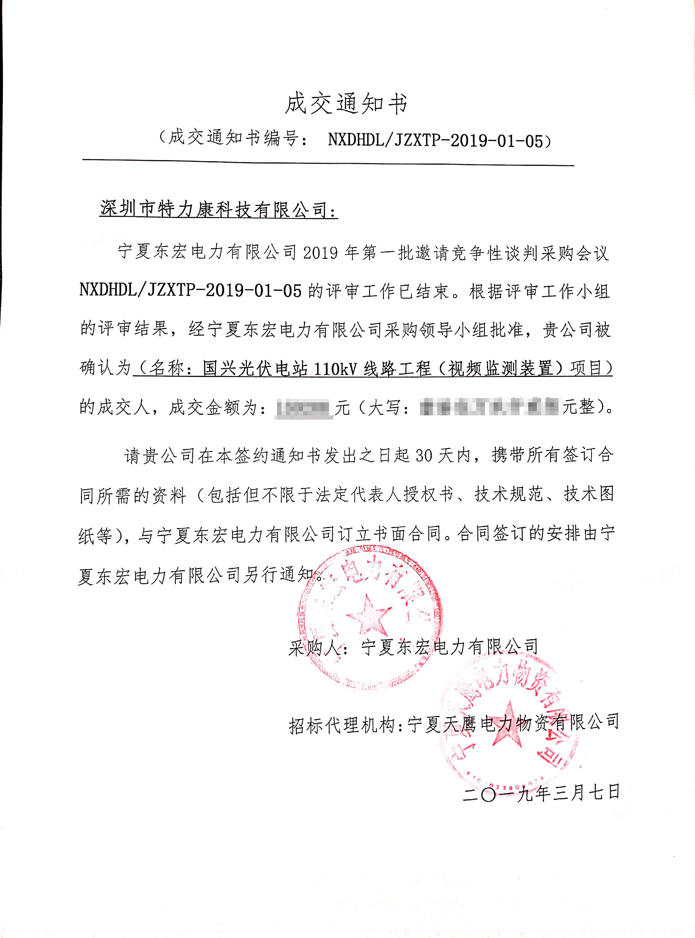 寧夏東宏電力公司2019年第一批(視頻監(jiān)控裝置)邀請(qǐng)競(jìng)爭(zhēng)性談判采購評(píng)審工作已結(jié)束,經(jīng)寧夏東宏電力公司招投標(biāo)領(lǐng)導(dǎo)小組批準(zhǔn),確定我司為寧夏東宏電力公司2019年第一批(視頻監(jiān)控裝置)邀請(qǐng)競(jìng)爭(zhēng)性談判采購項(xiàng)目中標(biāo)單位。