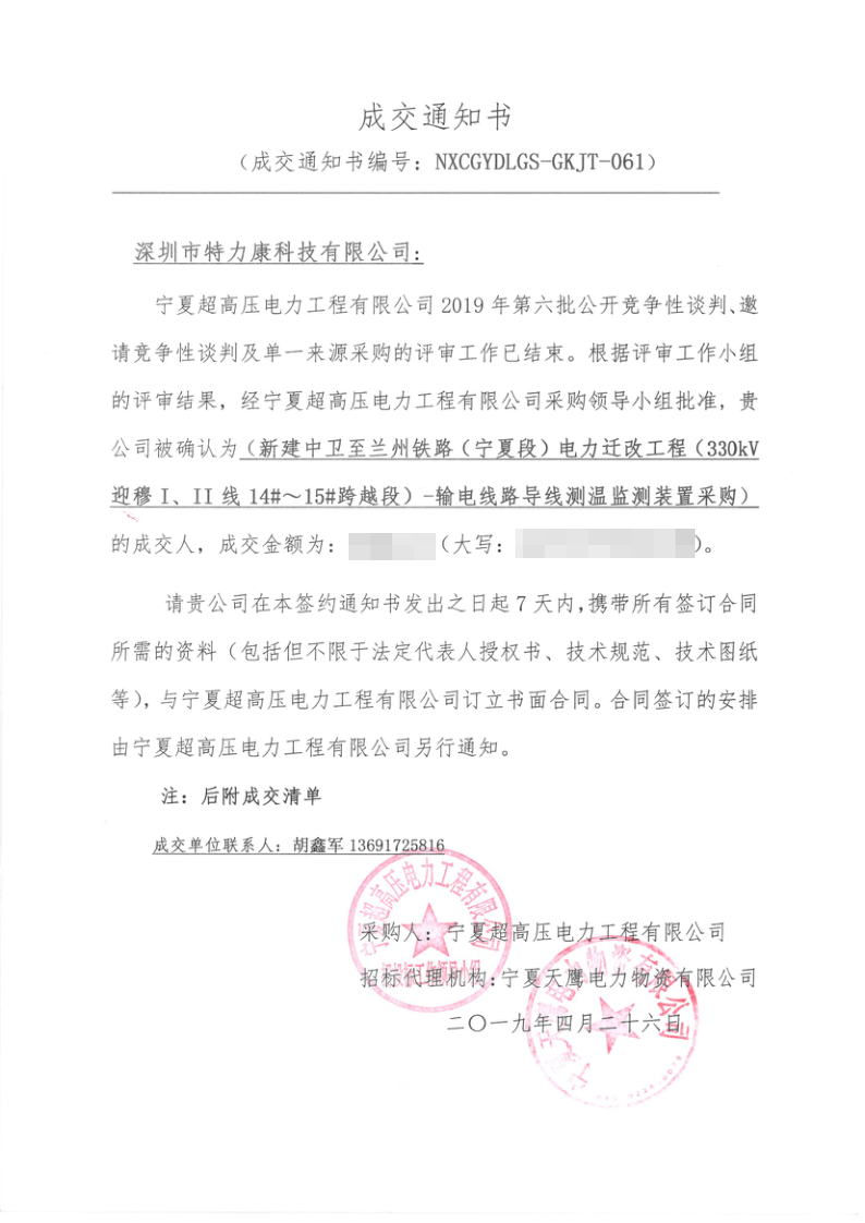 寧夏超高壓局2019年第六批公開競爭性談判電力遷改項目評審工作已結束,經評審委員會評審,經寧夏超高壓局招投標領導小組批準,我司被確定為此項目簽約單位現(xiàn)將公告公示。