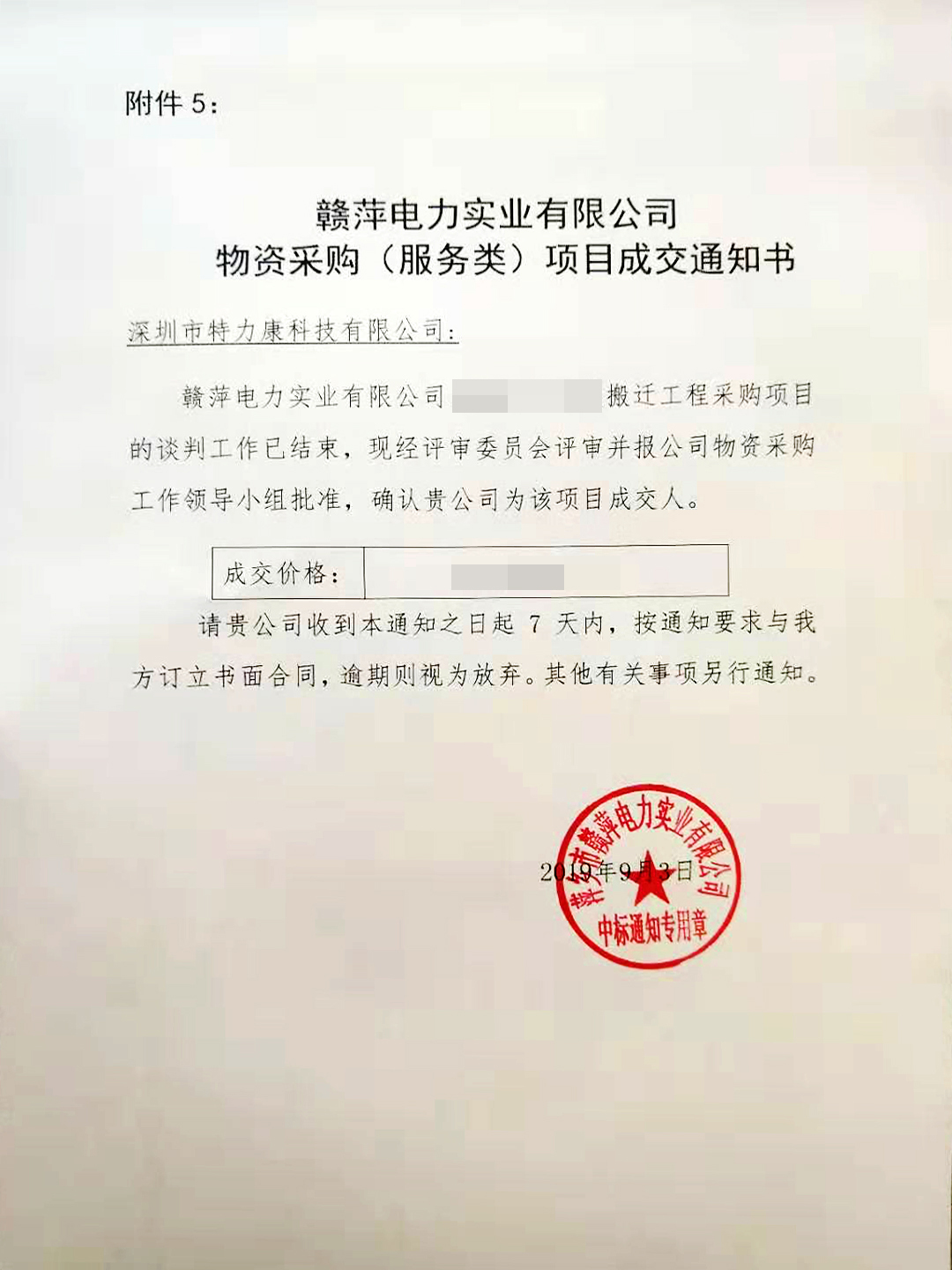 贛萍電力220KV線路搬遷工程采購項(xiàng)目談判工作已結(jié)束,經(jīng)招標(biāo)評審委員會評審,現(xiàn)確定我司以此次線路搬遷工程中標(biāo)單位。