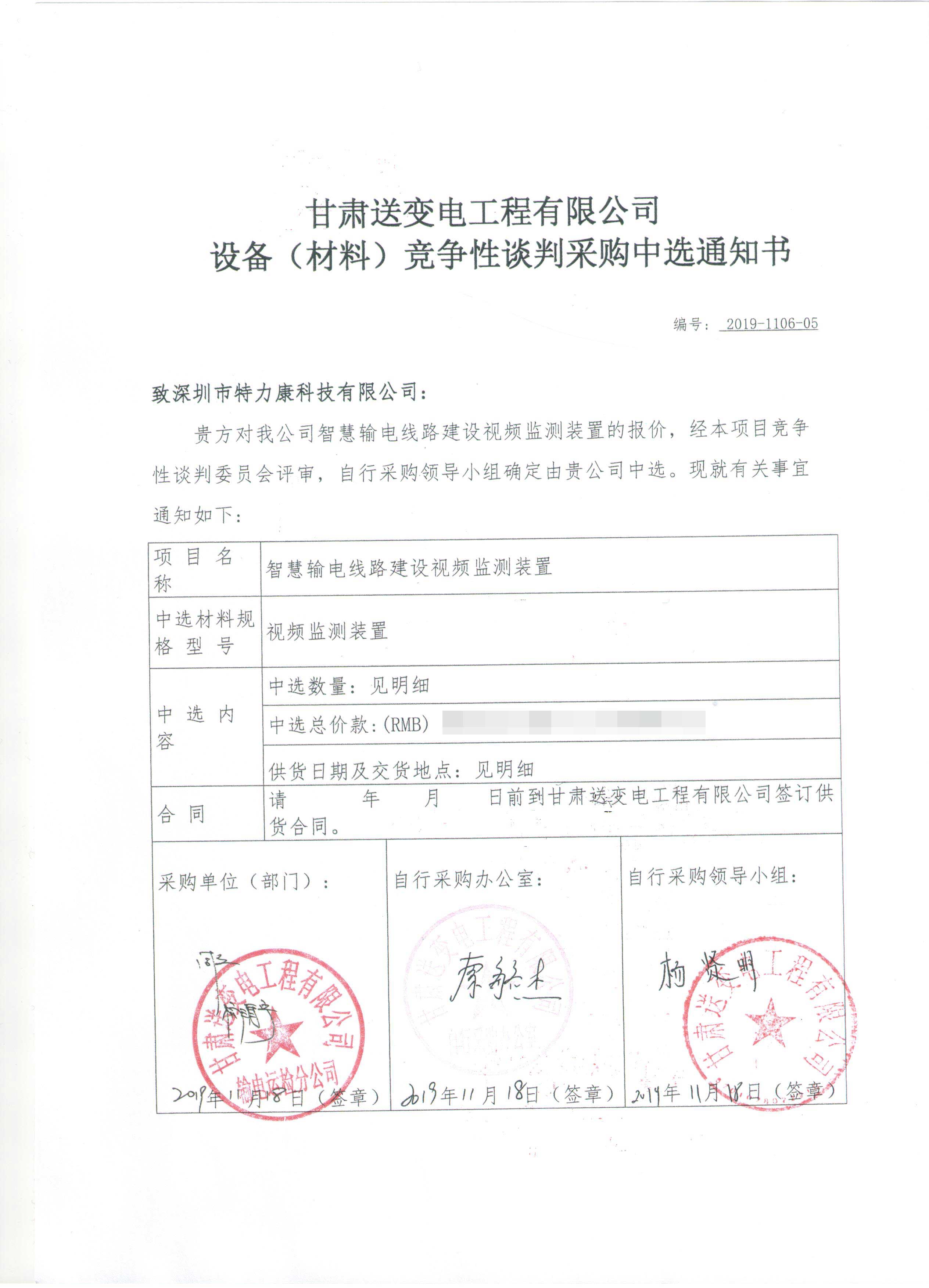 甘肅送變電工程有限公司智慧輸電線路建設(shè)視頻監(jiān)測裝置及靜莊高速改造在線監(jiān)測裝置競爭性談判采購工作已經(jīng)結(jié)束,根據(jù)評審委員會評審結(jié)果,招投標(biāo)領(lǐng)導(dǎo)小組批準(zhǔn),確定此次甘肅送變電工程有限公司智慧輸電線路建設(shè)視頻監(jiān)測裝置及靜莊高速改造在線監(jiān)測裝置競爭性談判采購由我司深圳市特力康科技有限公司中標(biāo),現(xiàn)將公告示下: