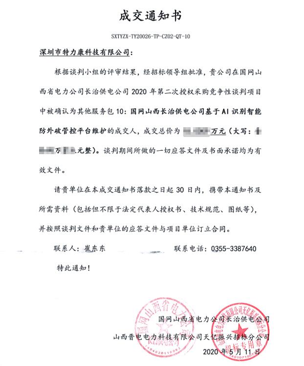 根據(jù)談判小組的評審結果,經(jīng)招標領導組批準,我司(深圳市特力康科技有限公司)在國網(wǎng)山西省電力公司長治供電公司2020年第二次授權采購競爭性談判項目中被確認為其他服務包10:國網(wǎng)山西長治供電公司基于AI識別智能防外破管控平臺維護的成交人?,F(xiàn)附中標通知書如下: