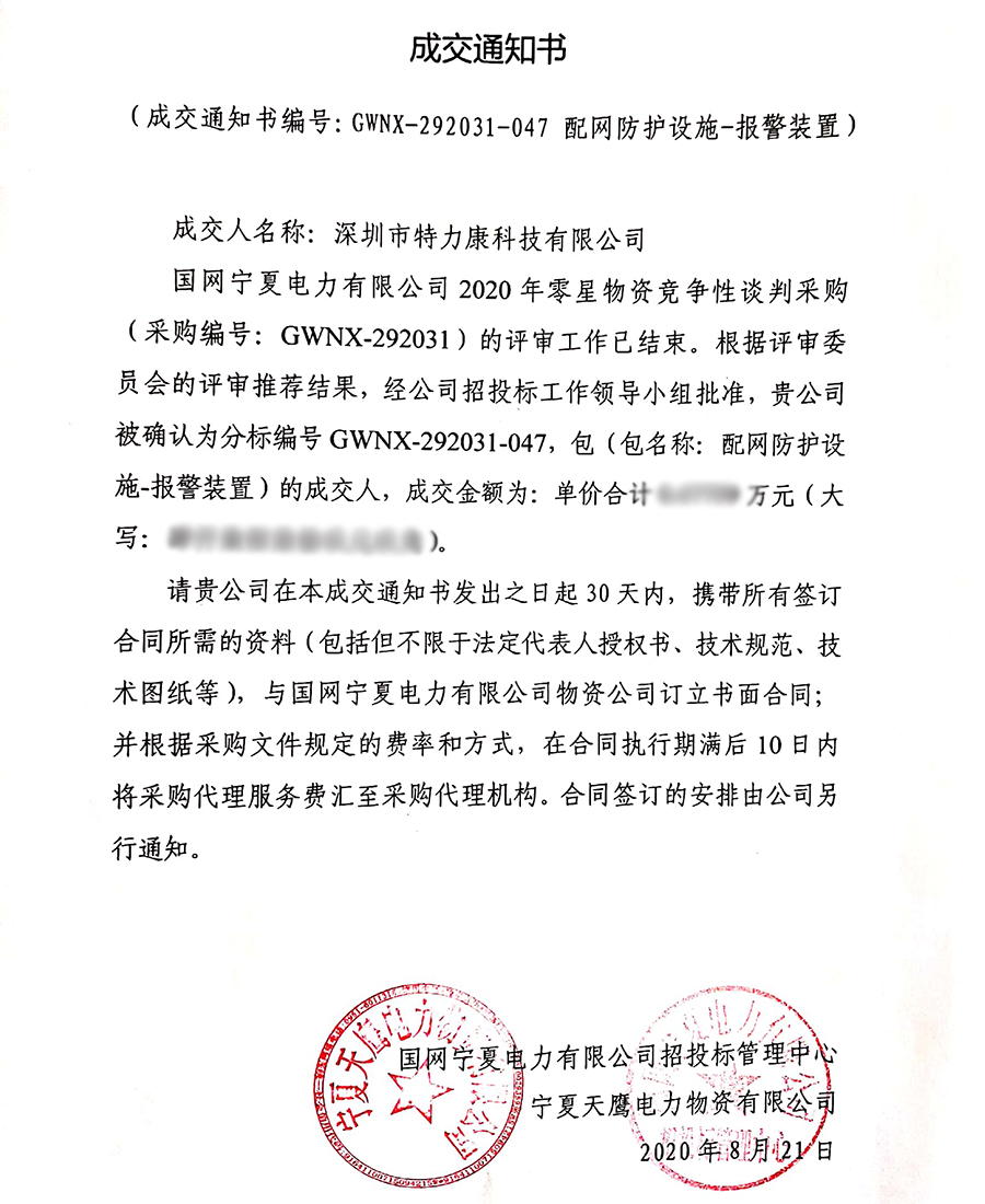 國網(wǎng)寧夏電力有限公司2020年零星物資競爭性談判采購(采購編號: GWNX-292031)的評審工作已結束。根據(jù)評審委員會的評審推薦結果,經(jīng)招投標工作領導小組批準,我司(深圳市特力康科技有限公司)被確認為分標編號GWNX-292031-047,包(包名稱:配網(wǎng)防護設施-報警裝置)及分標編號GWNX-292031-051,包(包名稱:技防系統(tǒng))的成交人,現(xiàn)發(fā)布成交通知書如下: