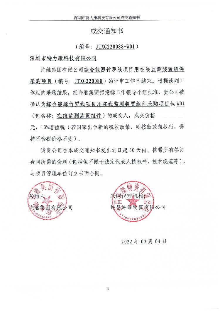 許繼集團(tuán)有限公司綜合能源竹羅線項(xiàng)目用在線監(jiān)測裝置組件采購項(xiàng)且(編號: JTX6220088)的評審工作已結(jié)束。根據(jù)談判工作組的采購結(jié)果,經(jīng)許繼集團(tuán)招投標(biāo)工作領(lǐng)導(dǎo)小組批準(zhǔn),貴公司被確認(rèn)為綜合能源竹羅線項(xiàng)且用在線監(jiān)測裝置組件采購項(xiàng)目包W01(包名稱:在線監(jiān)測裝置組件)的成交人,成交通知如下: