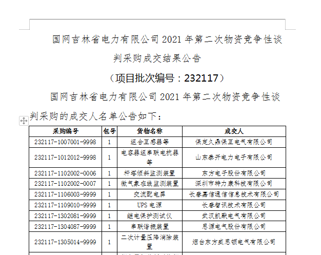 特力康中標(biāo)國網(wǎng)吉林省電力有限公司2021年第二次物資競爭性談判(項目批次編號: 232117)-微氣象在線監(jiān)測裝置,國網(wǎng)吉林省電力有限公司2021年第二次物資競爭性談判采購的成交人名單公告如下: